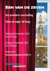 Zoals je wellicht al weet, is onze Gé Baay buiten speler ook regisseur. Komend weekend gaan de spelers van Theatergroep Assendelft het stuk ‘Eén van de zeven’ spelen. Een voorstelling met een lach en een onverwachte wending. Gé heeft dit stuk niet alleen geregisserd, hij schrééf het ook. Dubbel spannend maar ook dubbel leuk natuurlijk. Er zijn nog kaartjes en die reserveer je via deze link: https://theatergroepinassendelft.nl/aankomende-voorstelling/